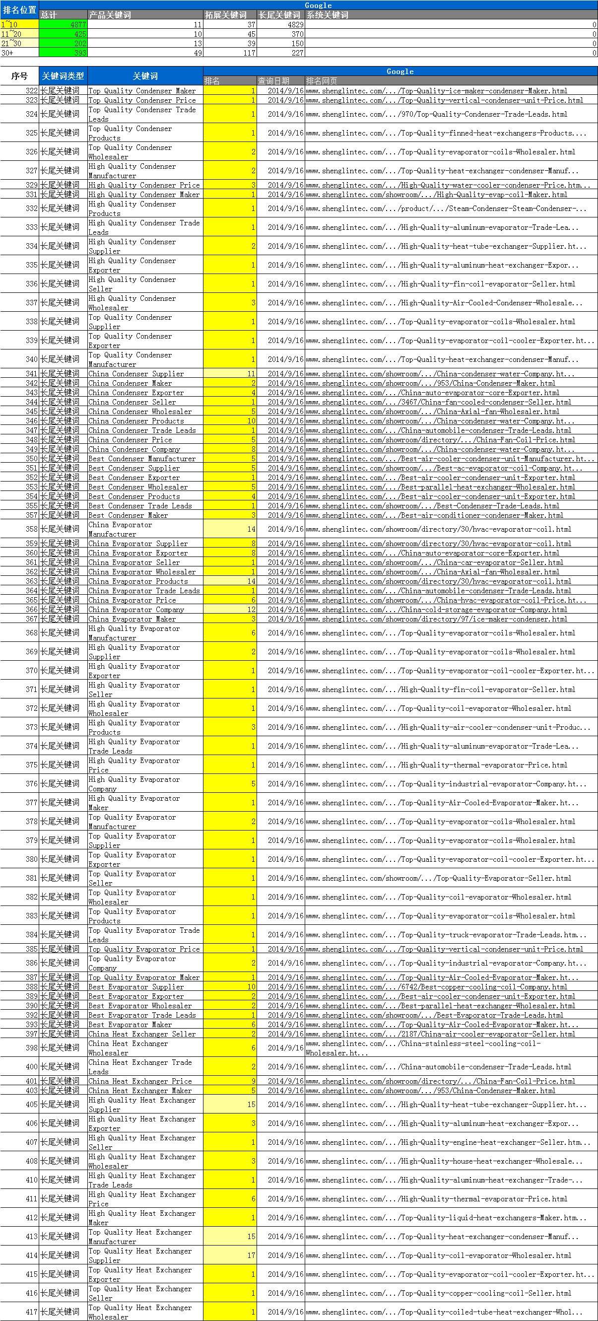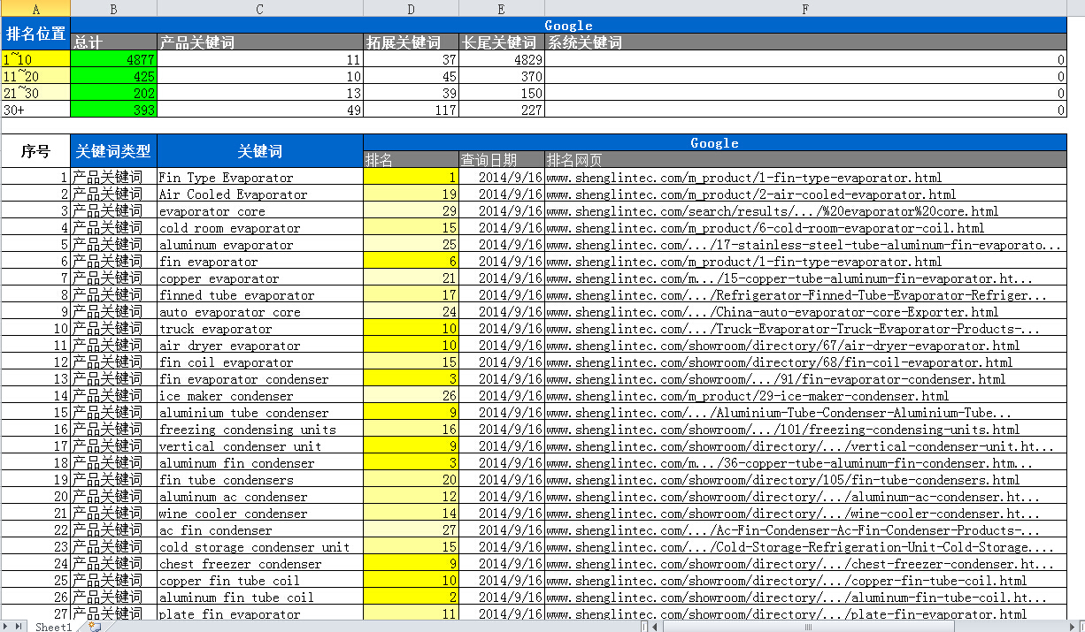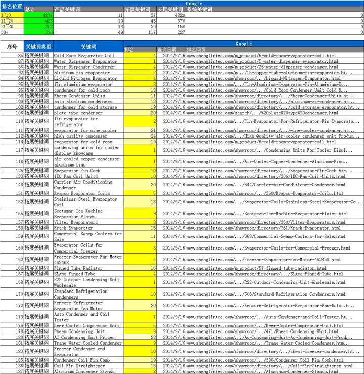 网站共部署5800多个词,依据产品,拓展,长尾关键词展开,按关键词级别不同分别部署到相对应的网站页面进行优化。共计4877个关键词排名GOOGLE首页,超过5500个排名前三页。