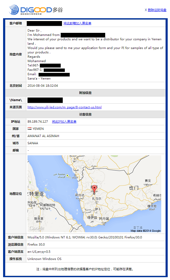 询盘数量仅计算有效的网站在线留言数量,访客通过EMAIL、电话或SKYPE等渠道直接发送的询盘未计算在内。网站推广不久收到35封有效询盘。